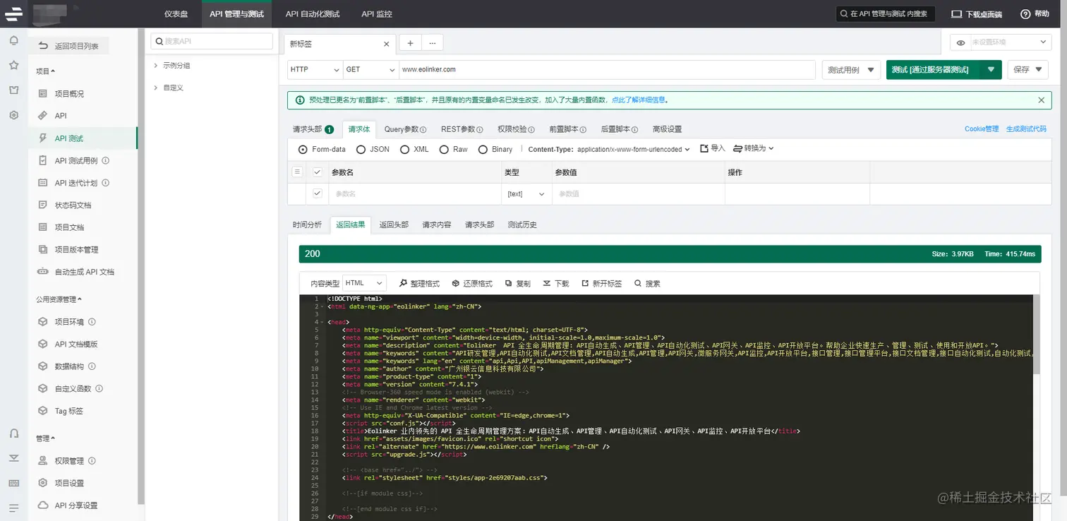 将URL粘贴到页面顶部的栏中,点击测试。在下列示例中,使用了GET方法调用了Eolinker官网:www.eolinker.com,并成功返回相关内容。