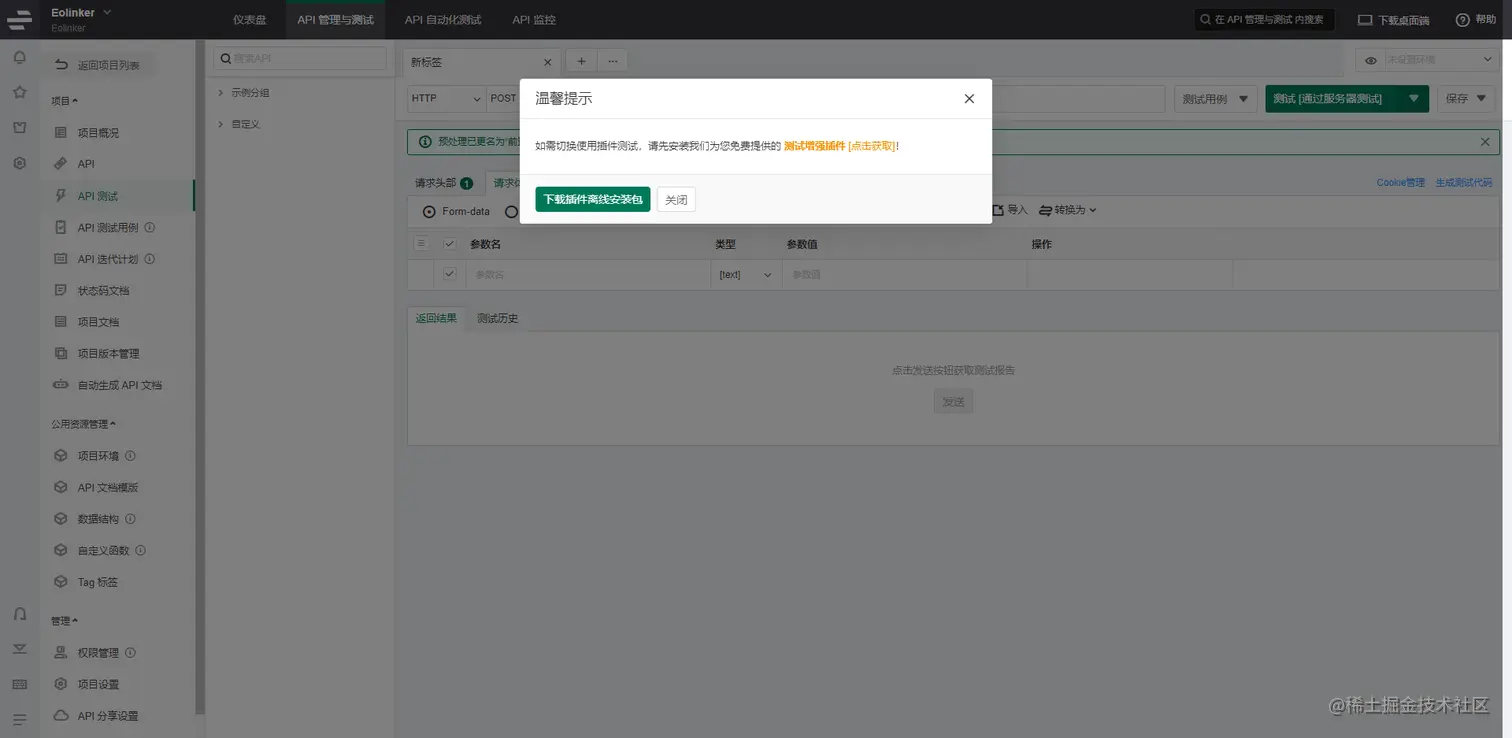 如果是第一次使用Eolinker,若API已上线可以直接使用服务器测试模拟真实用户对API发起请求。如果测试的是本地的API,则需要下载Eolinker Chrome扩展程序。选择插件测试页面会弹出下载框,下载后导入到Eolinker,或使用浏览器扩展商城进行下载。
