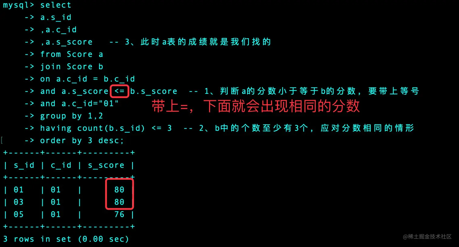 and a.s_score <= b.s_score -- 1、判断a的分数小于等于b的分数,要带上等号
