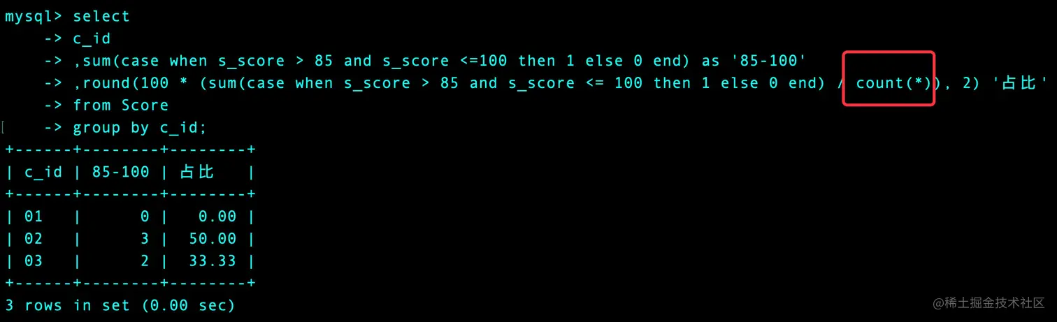 ,round(100 * (sum(case when s_score > 85 and s_score <= 100 then 1 else 0 end) / count(case when s_score then 1 else 0 end)), 2) '占比' -- 不同count(*)