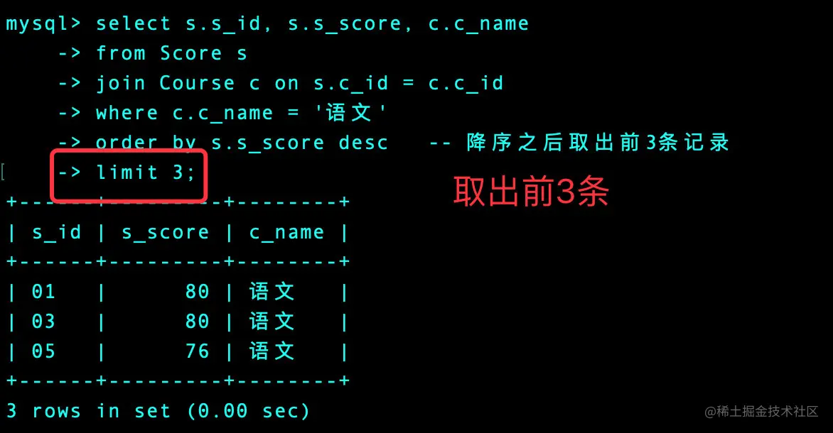 order by s.s_score desc -- 降序之后取出前3条记录