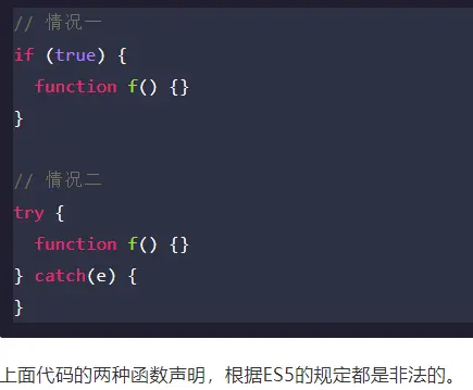 1.es5 中 正常的顶级作用域和函数作用域都可以函数声明,但是其他的如同if和 try的块级作用域都不允许函数声明,但是浏览器并不想报错。