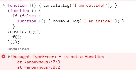 考虑到环境导致的行为差异太大,应该避免在块级作用域内声明函数。如果确实需要,也应该写成函数表达式,而不是函数声明语句。