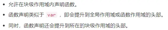 2.es6 中 允许了在所有块级作用域中函数声明,并且函数声明行为类似let一样在函数声明的块级作用域中才可以引用(也就是if(){如果你在这里做了函数声明})
