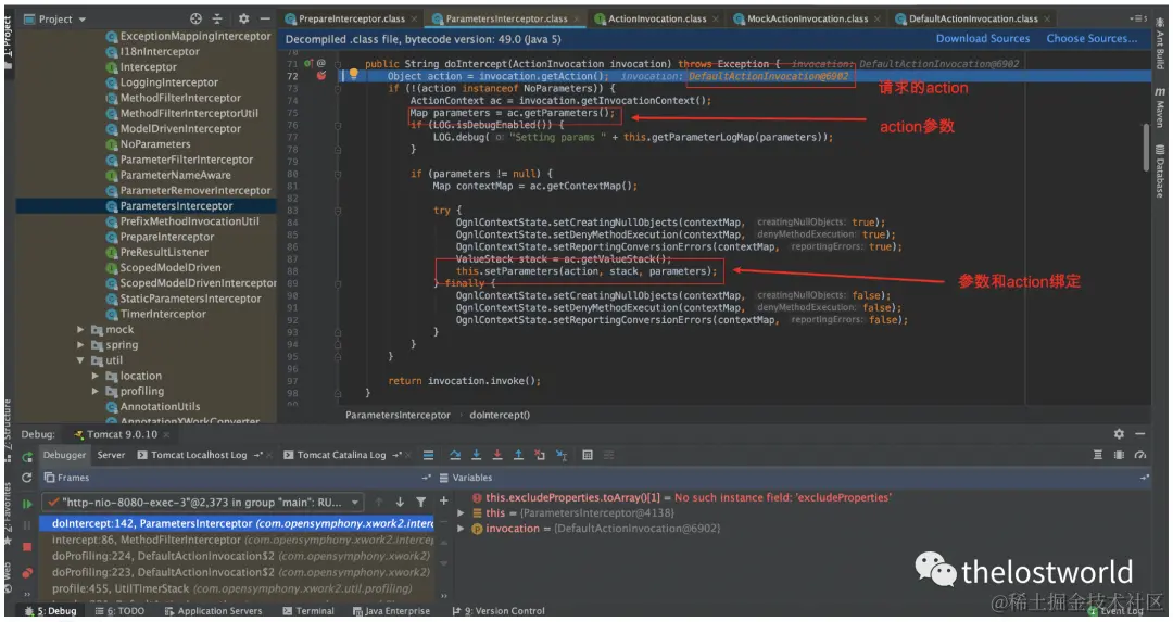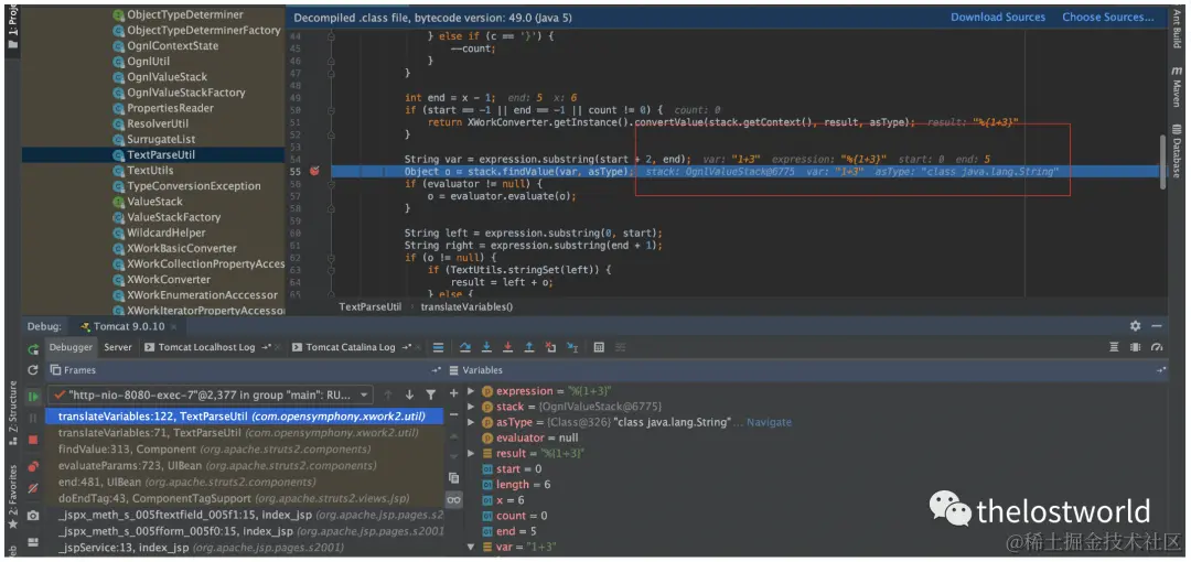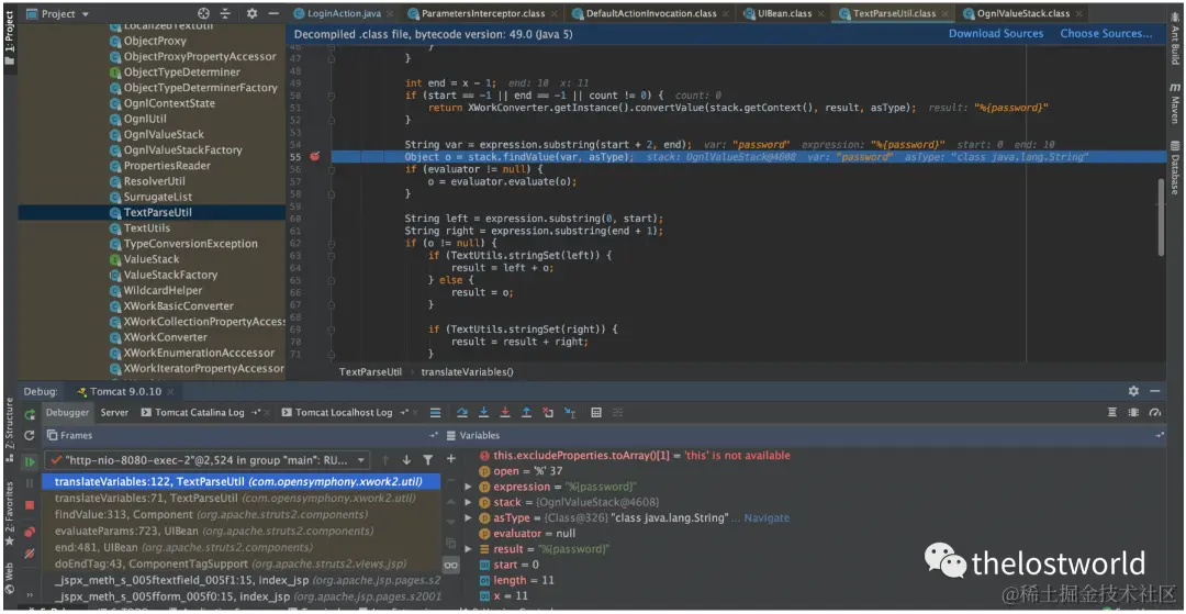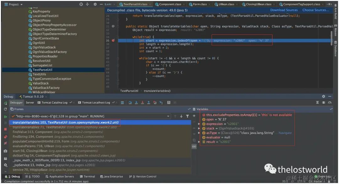 Struts2的运行流程是1、HTTP请求经过一系列的过滤器,最后到达FilterDispatcher过滤器。2、FilterDispatcher将请求转发给ActionMapper,判断该请求是否需要处理。3、如果该请求需要处理,FilterDispatcher会创建一个ActionProxy来进行后续的处理。4、ActionProxy拿着HTTP请求,询问struts.xml该调用哪一个Action进行处理。5、当知道目标Action之后,实例化一个ActionInvocation来进行调用。6、然后运行在Action之前的拦截器。7、运行Action,生成一个Result。8、Result根据页面模板和标签库,生成要响应的内容。9、根据响应逆序调用拦截器,然后生成最终的响应并返回给Web服务器。漏洞关键位置xwork-2.0-beta-1.jar!/com/opensymphony/xwork2/util/TextParseUtil.class中的translateVariables方法下断点。