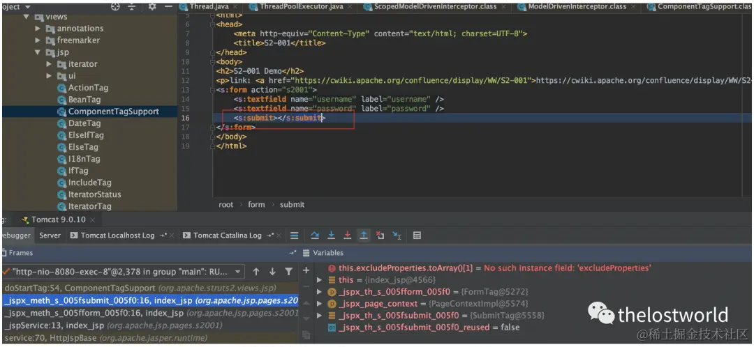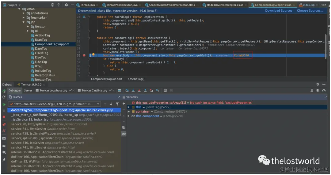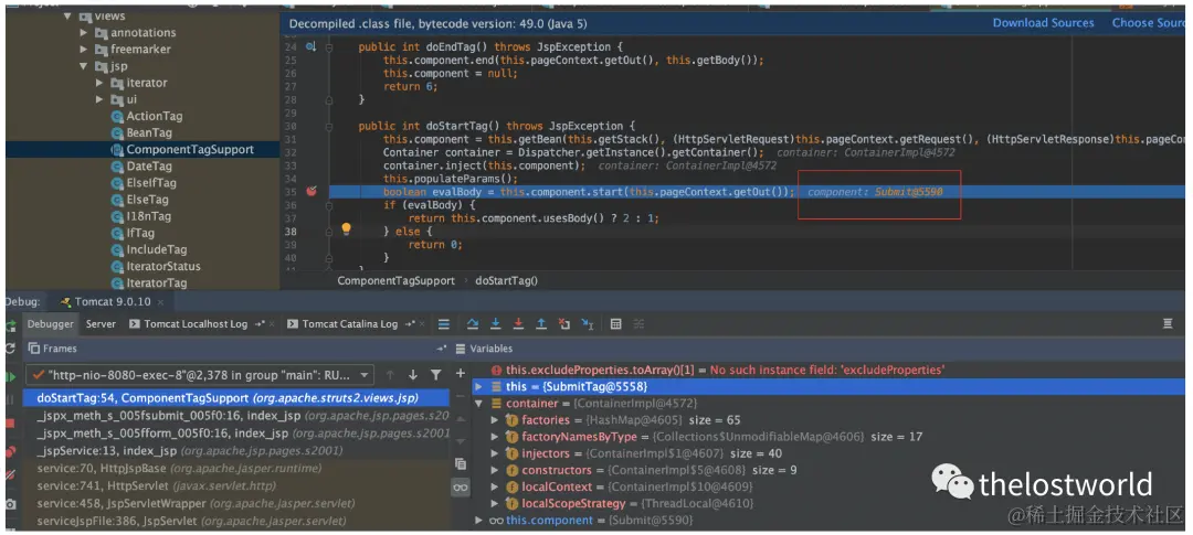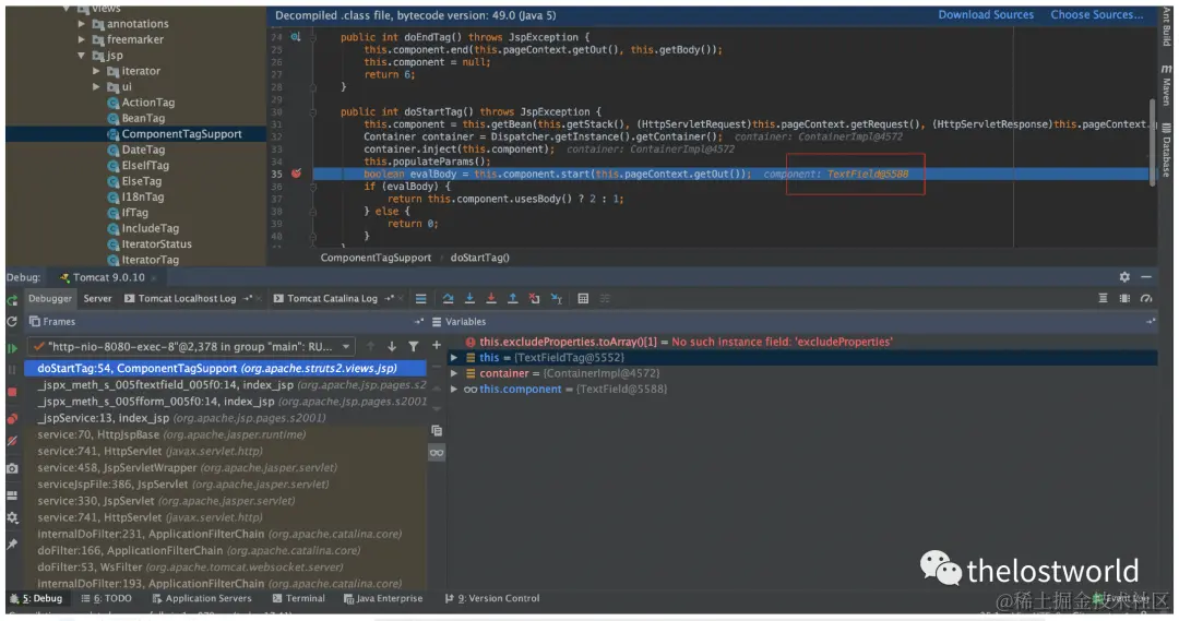直接跟到org.apache.struts2.views.jsp.ComponentTagSupport的doStartTag方法,这里会对jsp标签进行解析,从form标签开始,我们步入到解析textfield标签时。