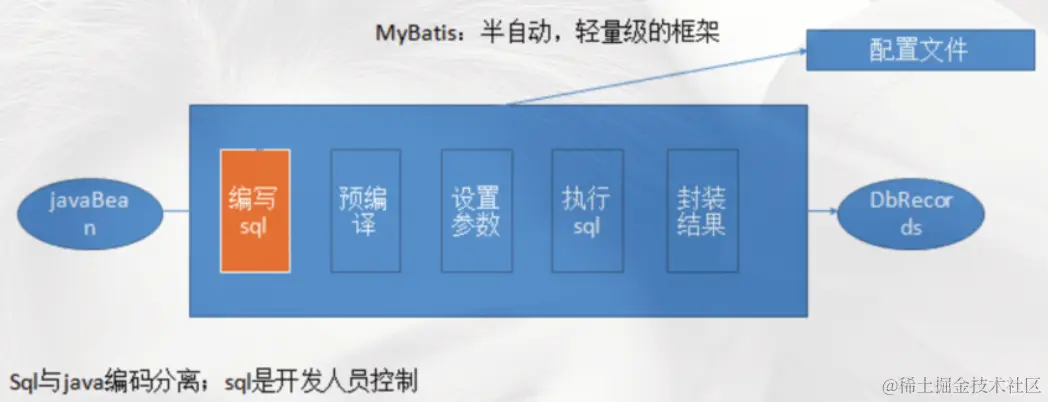 - MyBatis是一款优秀的基于ORM的半自动轻量级持久层框架,它支持定制化SQL、存储过程以及高级映射,对JDBC操作数据库的过程进行封装