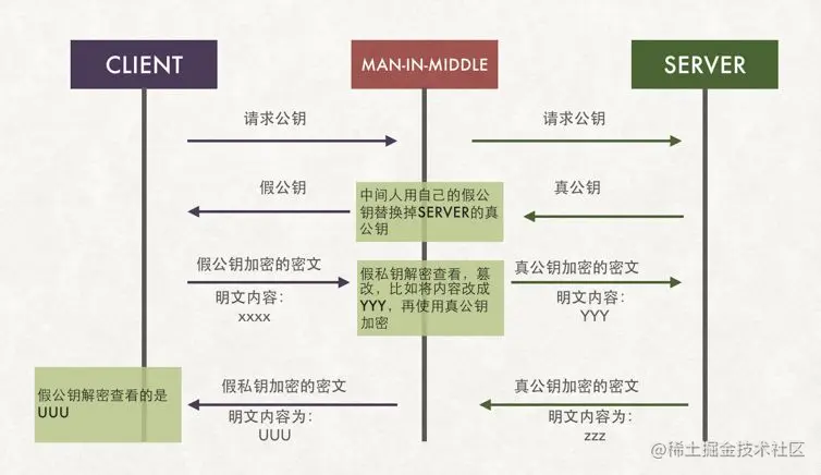 但是方案1有个问题:如果服务器端发送公钥给客户端时,被中间人调包了,怎么办?