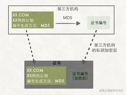 说到这里,想必大家已经知道上文所说的,证书就是HTTPS中数字证书,证书编号就是数字签名,而第三方机构就是指数字证书签发机构(CA)。