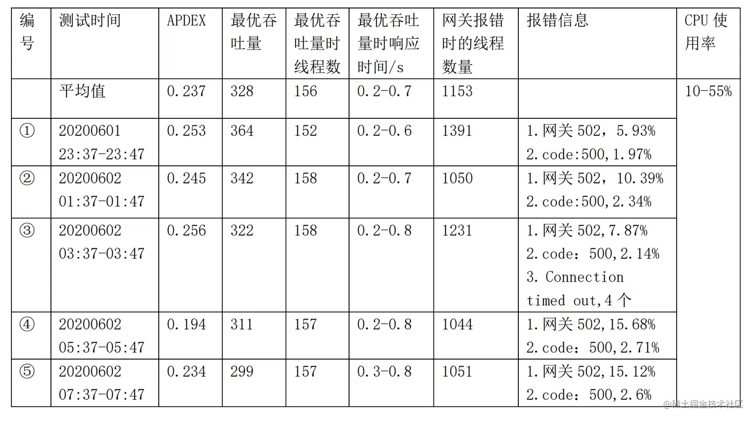 总共测试了五次,我们将五次测试报告分别做分析,然后汇总到如下表格,便可以得出测试结论。