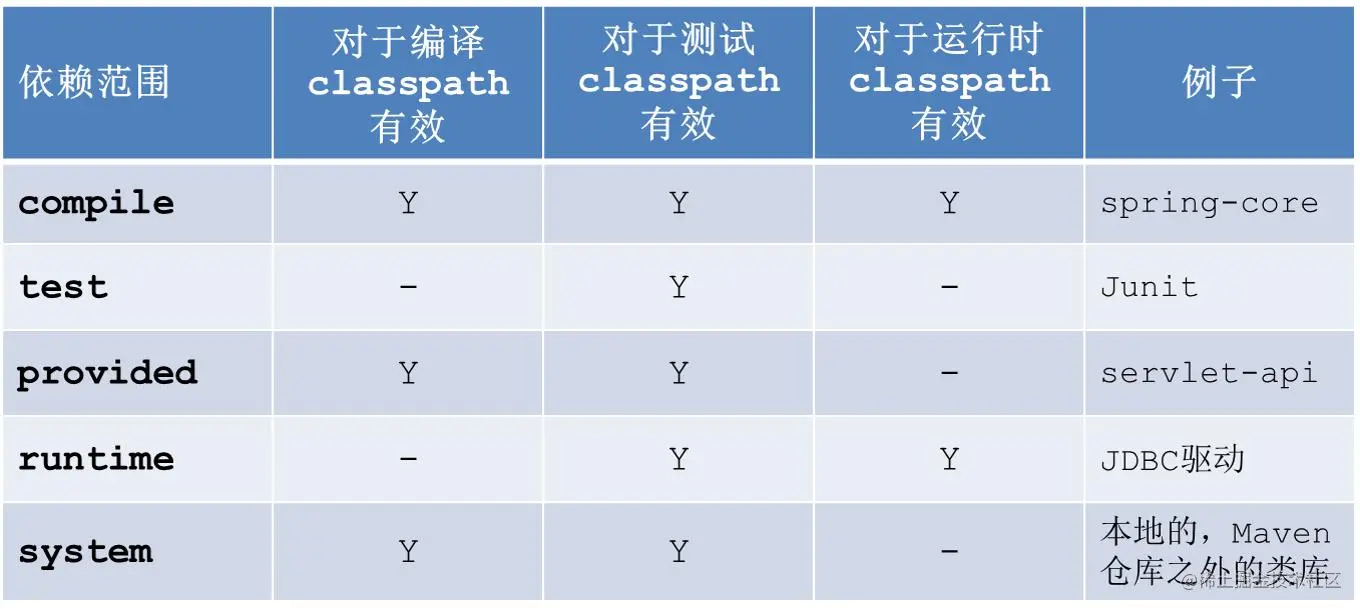 依赖范围就是用来控制依赖与这三种 classpath (编译 classpath、测试 classpath、运行classpath )的关系, Maven有以下几种依赖范围: