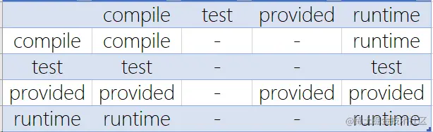 第一直接依赖的范围和第二直接依赖的范围决定了传递性依赖的范围,如下所示,最左边一行表示第一直接依赖范围,最上面一行表示第二直接依赖范围,中间的交叉单元格则表示传递性依赖范围。
