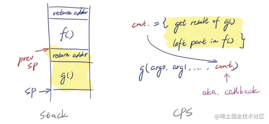 魔法的背后是 CPS 变换,CPS 变换把普通函数转换成一个 CPS 的函数,即 Continuation 也能作为一个调用参数。函数不仅能从头运行,还能根据 Continuation 的指示继续某个点(比如调用 IO 的地方)运行。