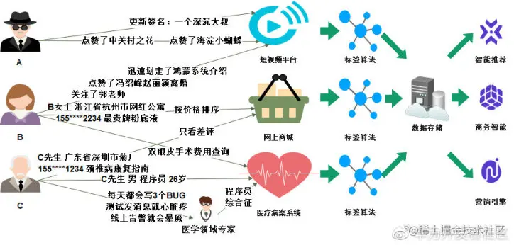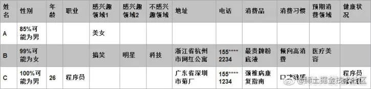 三个不同的用户在同一公司旗下的不同 APP 中留下了大量的行为数据,这些数据中包含了直接填写的用户资料、使用 APP 的具体行为以及领域专家对某些现象的标记,通过后台的标签算法可以得到这样的数据:
