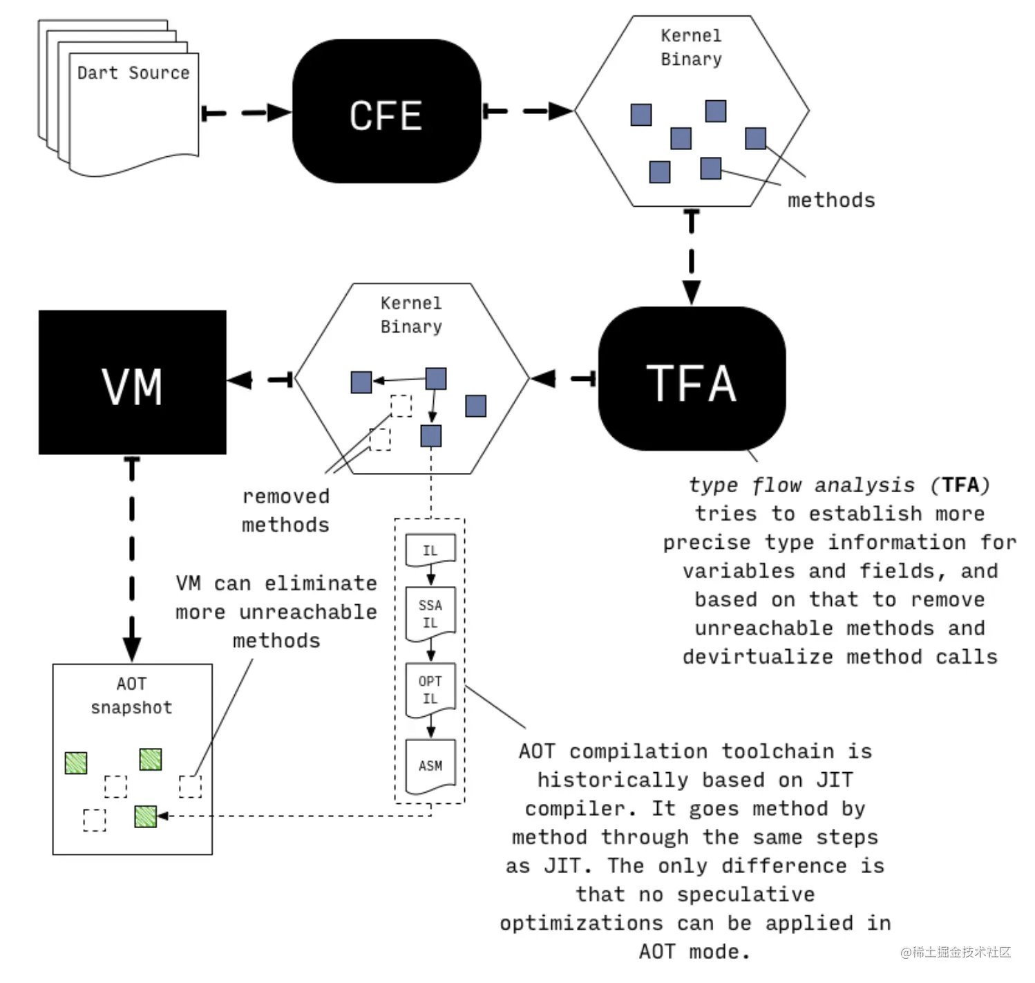 为了满足上述要求,AOT compilation pipeline中引入了type flow analysis(TFA)对代码进行全局静态分析,其中包括找出所有可达代码、确认哪些类有被实例化过、确认变量类型的流动过程等等。所有的分析都是保守的,也就是说更注重正确性,而非像JIT一样更注重性能表现(因为JIT可以随时解优化回到未优化版本以保证正确性)。