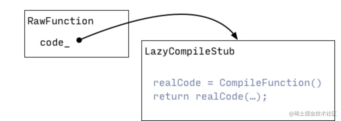 初始状态下每个函数中并没有真正的可执行代码,而是包含一个指向LazyCompileStub(全部函数共享)的占位符,LazyCompileStub会请求runtime生成当前函数的可执行代码并建立映射关系,以后每次调用都会返回对应代码段的执行结果。