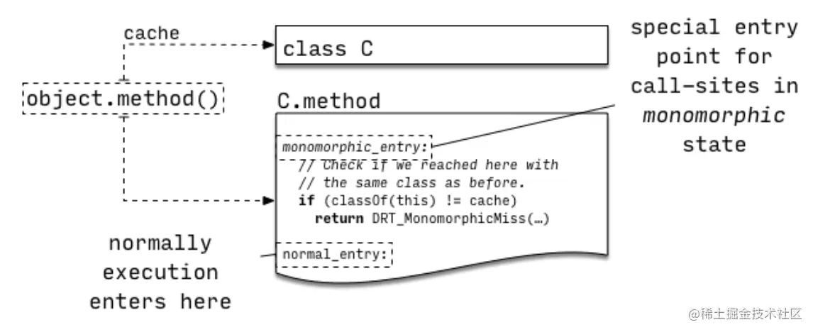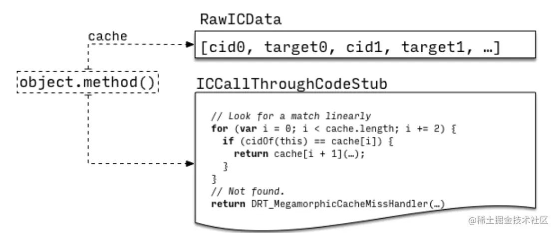 第二种情况是对象调用的方法不再是C.method或者在single target state下发生了miss,这时就不得不去寻找新的调用方法了,于是调用点进入IC State,这和我们之前介绍的incline cache模式十分相像——cache中保存不同类对应的调用方法,在stub中进行线性查找。