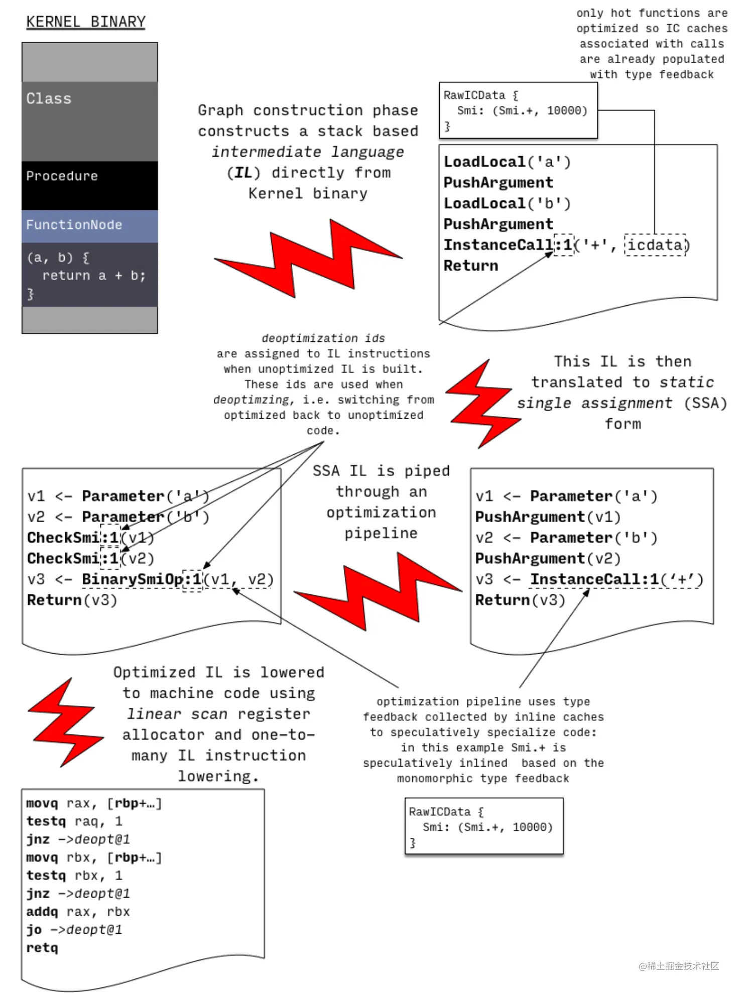 但这个假设在17行被打破,printAnimal()函数接收了一个Dog对象,不再符合“obj永远是一个Cat对象”的假设,这个时候之前的优化代码就不管用了。因此我们需要解优化,即回到优化之前的版本,这时我们的deoptimization id就可以发挥作用了,VM中就是通过它来找到对应未优化版本代码的正确位置并继续执行。(这个过程需要非常小心,因为在函数运行过程中跳转到其他位置执行容易产生side-effect)