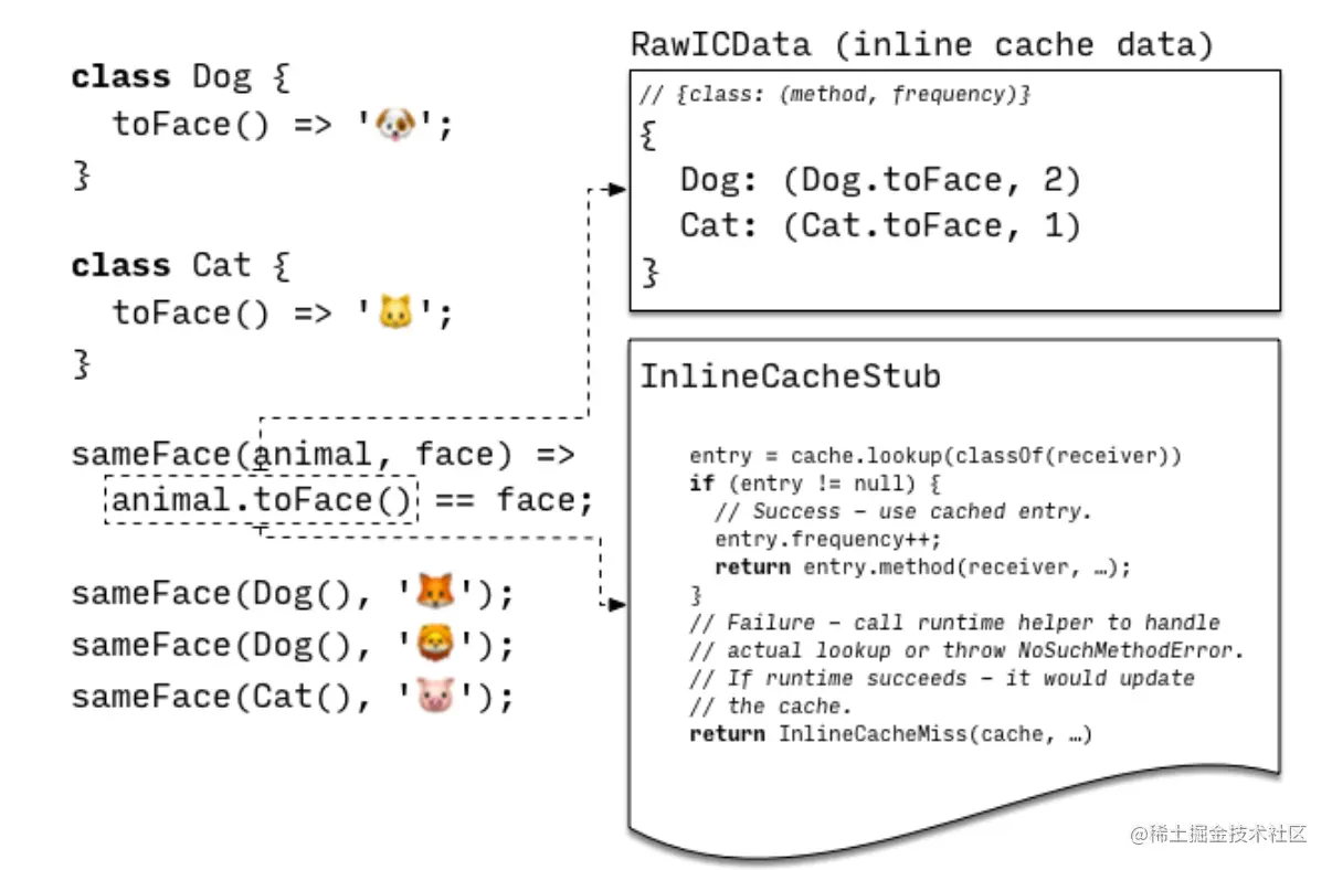 下图给出了一个简单的示例,可以看到在animal.toface()这个动态调用点上关联了一个cache和引用了InlineCacheStub代码段。