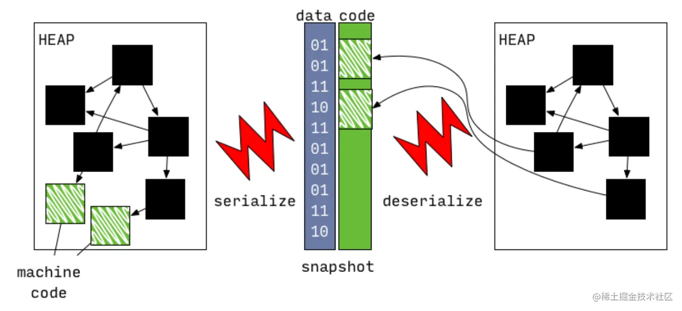 最初snapshot是不包含机器码的(如上图所示),但在后来的AOT模式中加入了这一特性,所以现在的snapshot在解析后不仅可以快速构建数据结构,还可以获得可执行代码,结构大致如下,其中machine code本身就是二进制的,所以并不需要特意序列化和反序列化。