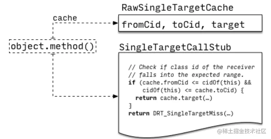 Inline cache stub:这份stub被所有cache所共享,因为执行逻辑都是一样的:首先对调用点cache进行线性查找,若存在匹配的类则直接绑定对应方法;若没找到则调用runtime完成调用解析,并更新cache,下次遇到相同的类就不用再调用runtime了。