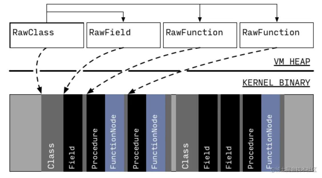 VM会加载kernel binary并解析成对应的对象模型,但这个过程是lazy的(如下图):一开始只有关于library和class的基本信息会被加载成heap中的entity,每个entity都含有一个指向生成它们的binary的指针,当以后被需要的时候可以生成更多信息。
