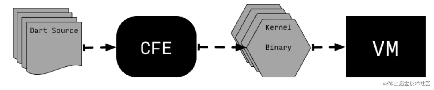 那么在这种模式下Dart VM是如何工作的呢?实际上从dart2开始Dart VM已经不再直接面向源码工作了,而是面向中间文件kernel binary file(这是一个.dill文件,其中包含序列化的kernel AST)。而将源码翻译成kernel binary的工作是由dart sdk中的一个工具common front-end (CFE)完成的,它也被其他一些工具所共享(包括VM,dart2js,Dart Dev Compiler等)。
