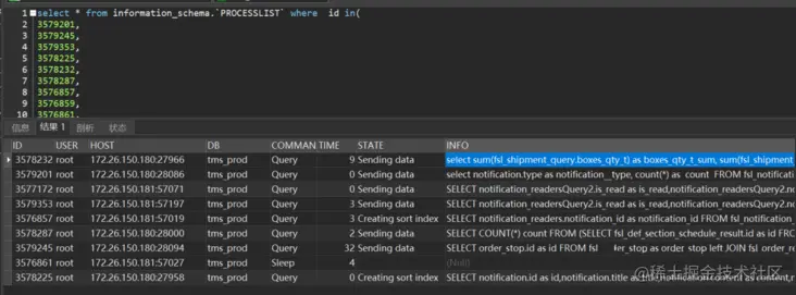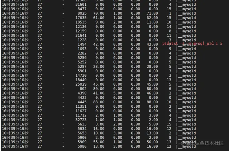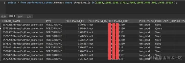 通过该命令我们可以定位到802、4445等线程消耗了大量的CPU,这里尽量确保在pidstat的多个样本中验证消耗是恒定的。根据这些信息,我们可以登录到数据库,并使用以下查询找出哪个MySQL线程是罪魁祸首。