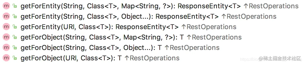 返回值类型一共有两类,getForEntity 和 getForObject,每一类有三个重载方法。