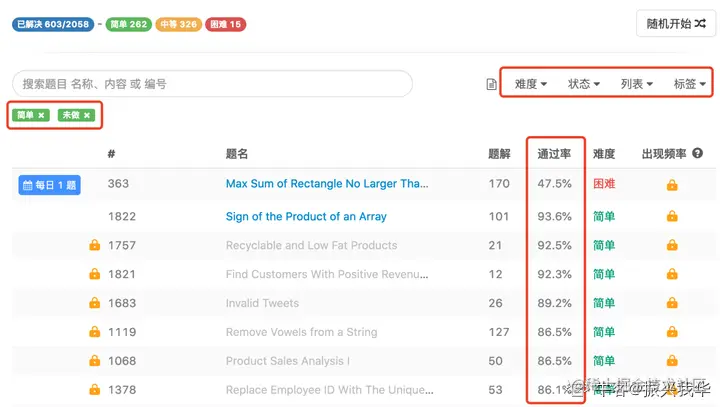 刷完 Leetbook 专栏后,进入题库,利用 LeetCode 自带的题目筛选和排序功能,能够帮助我们由简单到中等再到困难,渐进式刷题。一般来说,先刷通过率较高的题目,相对比较容易。