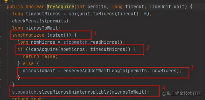- Step3: 申请令牌并获取等待时间,在我们tryAcquire中的timeout参数就是就是我们的最大等待时间,如果我们只是调用tryAcquire(),不会出现等待,第二步的时候已经快速失败了。