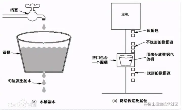 在漏斗算法中我们需要关注漏桶和匀速流出,不论流量有多大都会先到漏桶中,然后以均匀的速度流出。如何在代码中实现这个匀速呢?比如我们想让匀速为100q/s,那么我们可以得到每流出一个流量需要消耗10ms,类似一个队列,每隔10ms从队列头部取出流量进行放行,而我们的队列也就是漏桶,当流量大于队列的长度的时候,我们就可以拒绝超出的部分。
