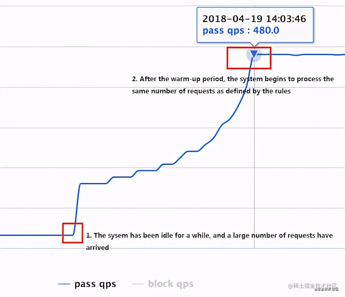 - Warm Up:设置为Behavior为CONTROL_BEHAVIOR_WARM_UP,类似之前guava中介绍的warmup。预热启动方式。当系统长期处于低水位的情况下,当流量突然增加时,直接把系统拉升到高水位可能瞬间把系统压垮。这个模式下QPS的曲线图如下: