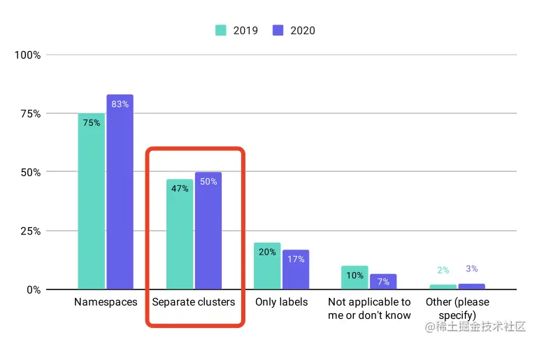 (2)业务隔离。据 CNCF 2020 云原生调查报告显示 [2],用多个集群做应用隔离是仅次于用 namespace 隔离的使用方式,使用率从 2019 年的 47% 上升到了2020年的 50%。多个业务仍共用一个流量入口时,接入层需具备多集群服务发现的能力,将流量按指定策略路由至指定集群的服务。