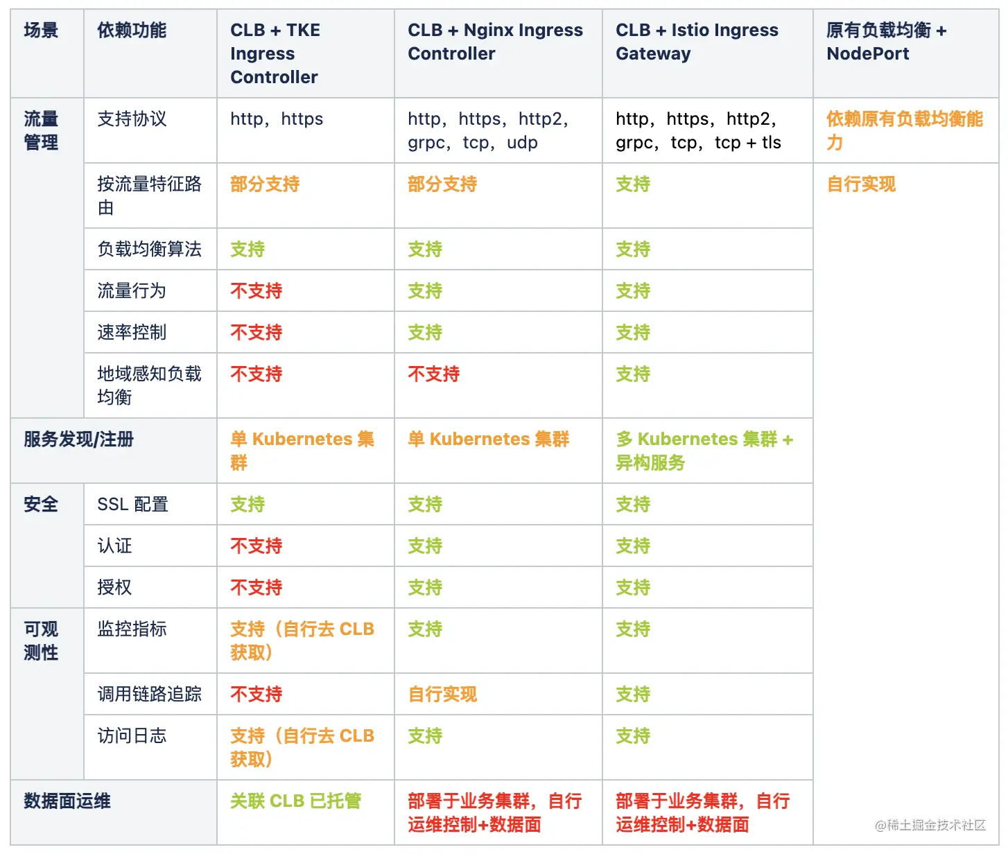 以下是腾讯云容器环境下常见的接入层解决方案功能对比。