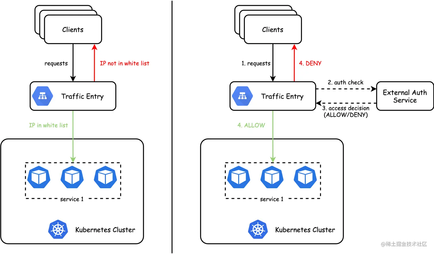 在入口处配置授权策略,根据流量内容特征,允许/拒绝流量访问,例如在入口处配置 IP 黑/白名单;或有外部鉴权服务,希望入口组件可对接外部鉴权服务,按照其返回的鉴权结果放通/拒绝流量。