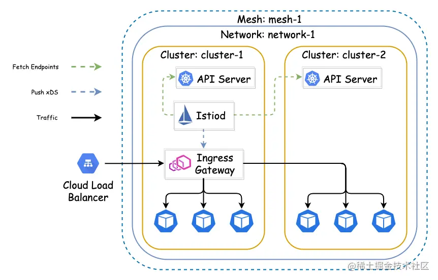 Istiod 可以通过网格内所有集群的 API Server 来获取 endpoints 信息,聚合多个集群的信息后,将最终生成的配置推送到 Ingress Gateway,Ingress Gateway 可以将请求按需转发至网格内所有 Pod。