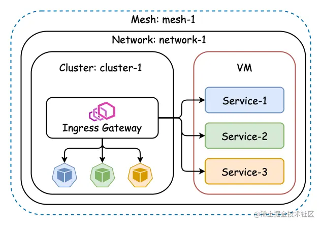 可以通过 Istio 提供的 WorkloadGroup 和 WorkloadEntry 将虚拟机上的服务注册到网格内,同一个服务可以同时运行在 Kubernetes 集群和虚拟机上。
