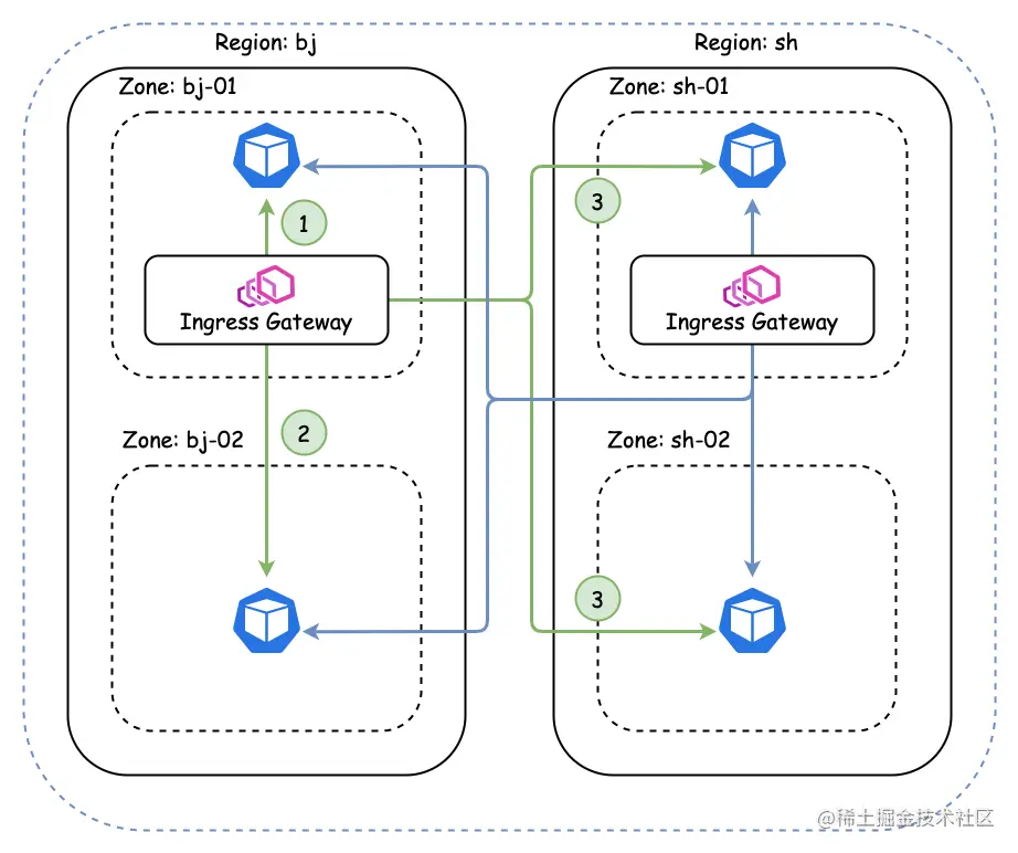 在开启地域负载均衡的情况下,Istio 会告知 Ingress Gateway 将请求就近转发。 当所有实例都正常时,请求将保持在同一地点,当实例异常时,流量会分发到下一优先地域的实例。