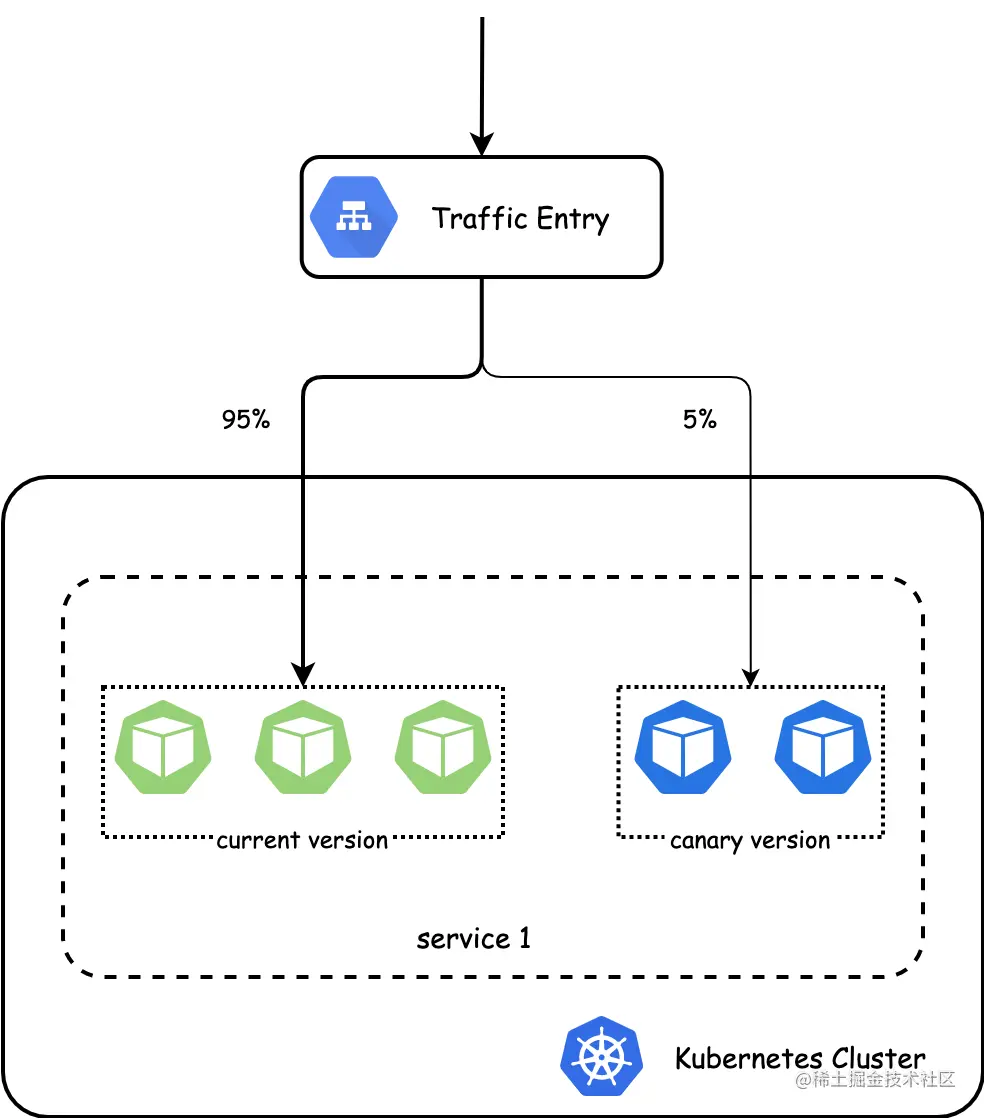 Istio 可通过 Virtual Service 配置基于权重的灰度发布,以下是配置来自 {namespace}/{gateway} 的入口流量 95% 路由到 {service} 的 current 版本,5% 路由到 canary 版本的示例: