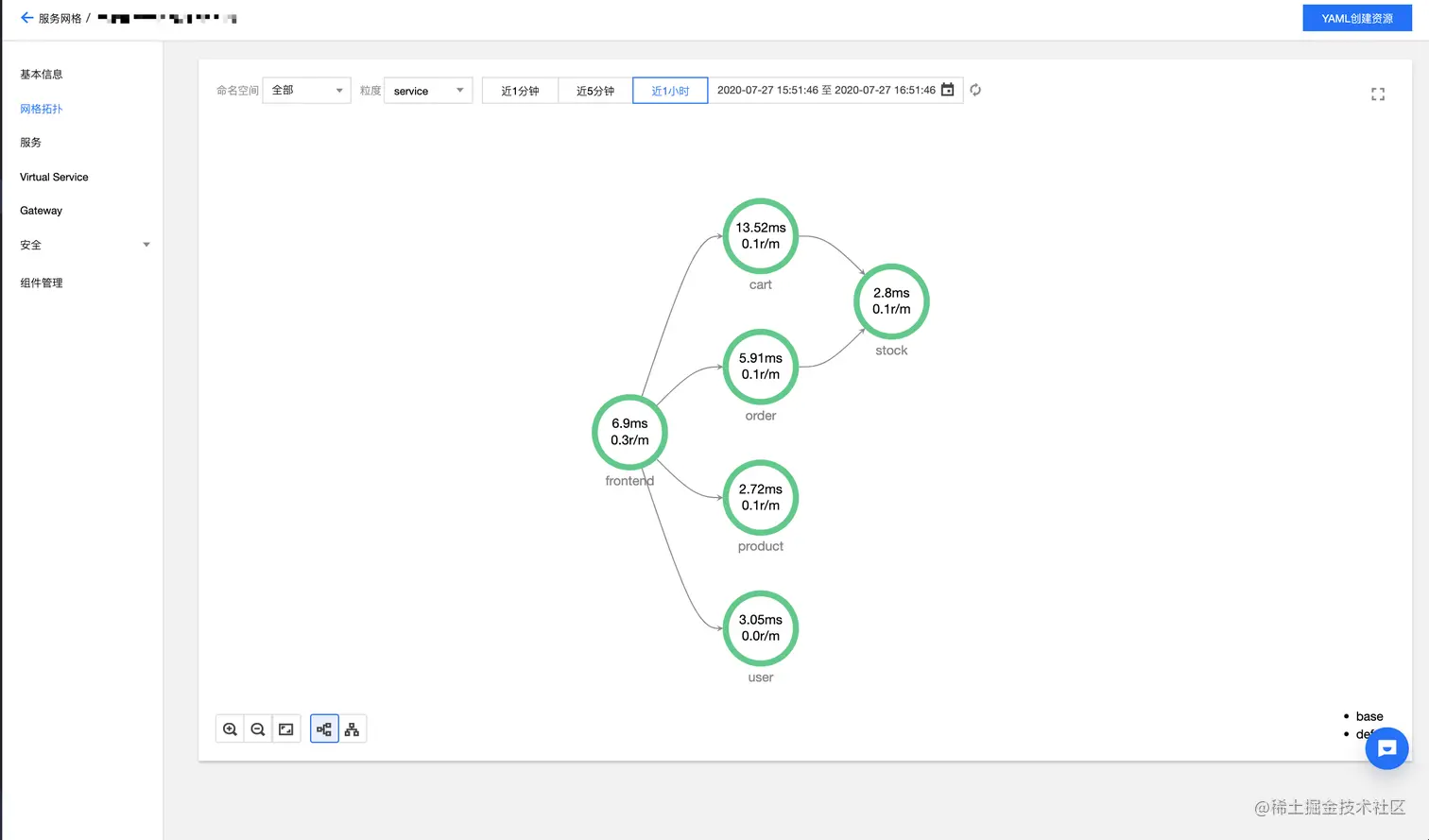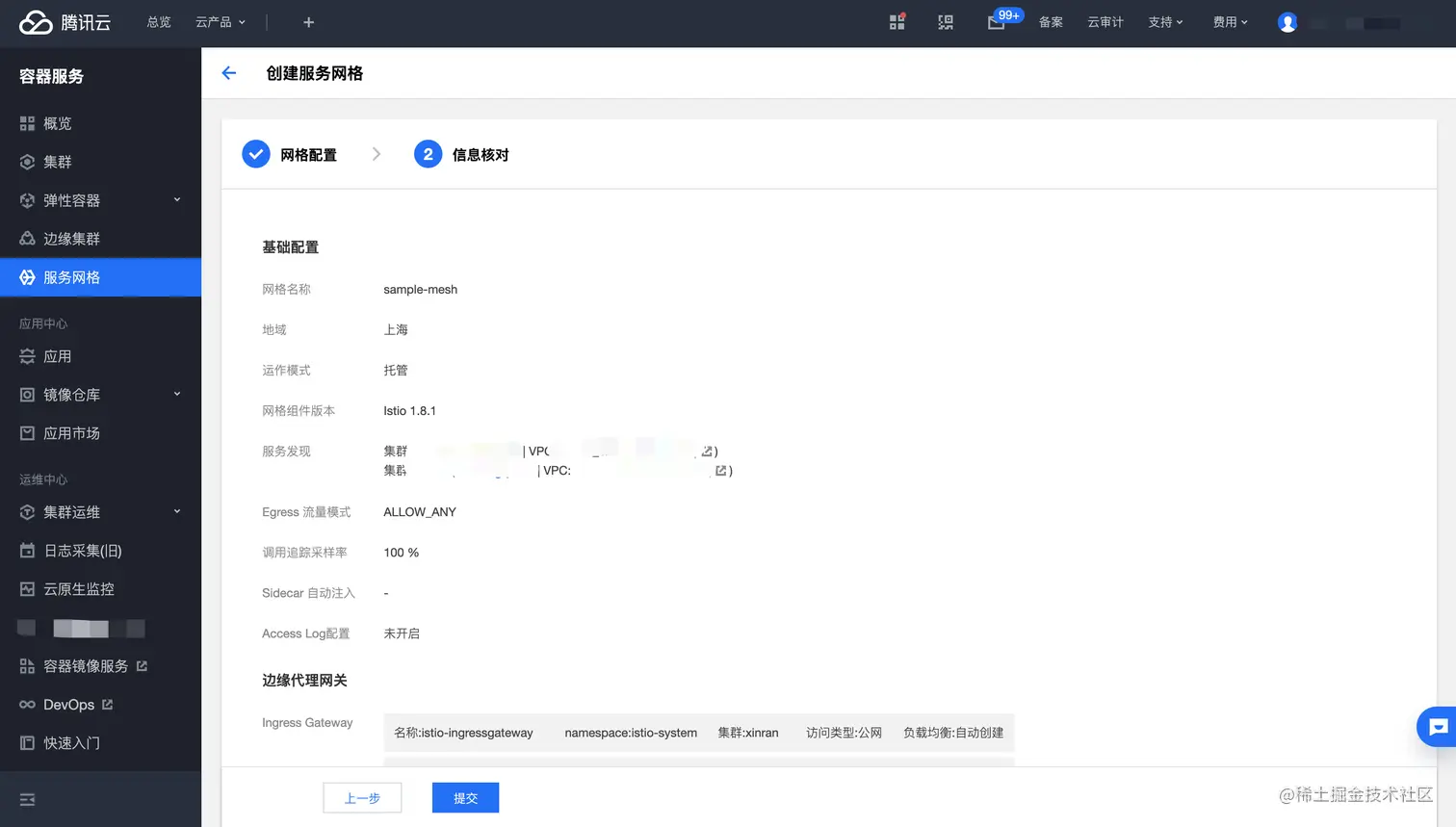 - 创建服务网格,添加两个部署服务的服务发现集群(基础监控指标自动对接到云监控,可在控制台查看,可视情况开启云原生监控,满足自定义监控诉求),勾选启用 Ingress Gateway