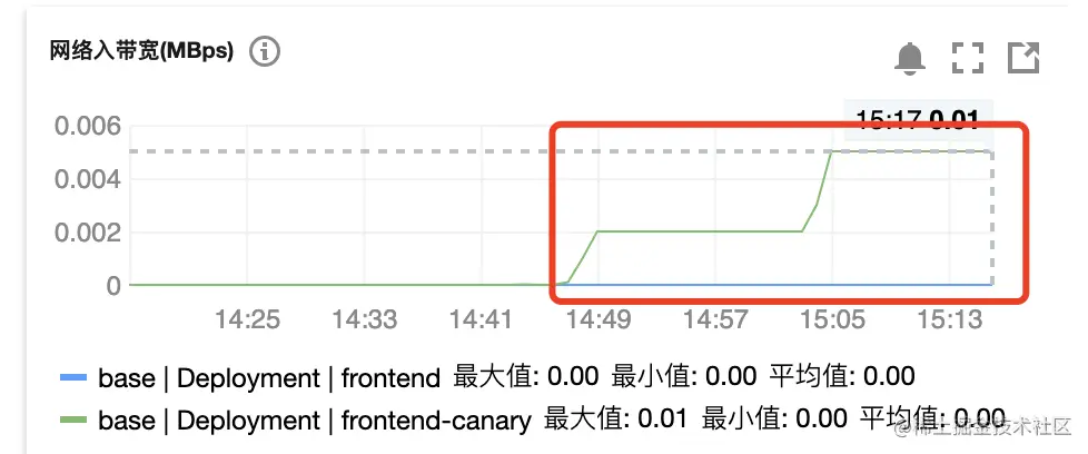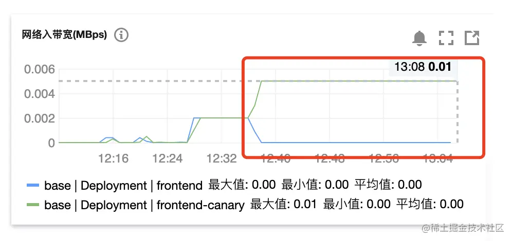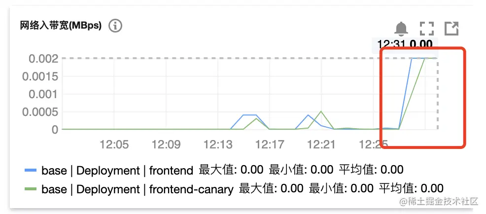 - 下面我们通过调整其中一个集群的 frontend 服务工作负载 Pod 数量为 0 来模拟其中一个集群 frontend 服务故障情况,发现其中一个集群 frontend 服务故障后,仍可以正常访问该服务,查看另一集群的 frontend 服务的工作负载监控,会发现入带宽增加了一倍,表明其中一个集群的服务故障后,流量容灾切到了另一集群。